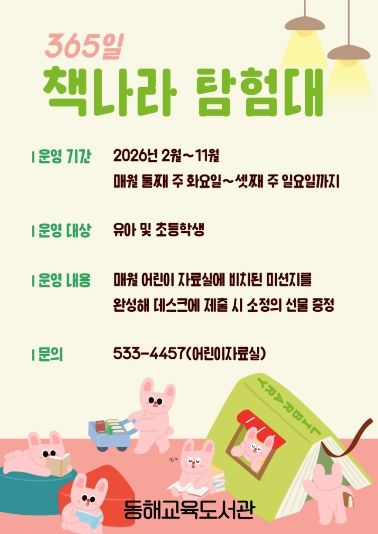 한방통신사 양호선기자 기자 | 동해교육도서관(관장 안은희)은 어린이들의 독서 흥미를 높이고 도서관 방문을 활성화하기 위해 어린이 독서활동 프로그램 ‘365일 책나라 탐험대’를 운영한다고 밝혔다.