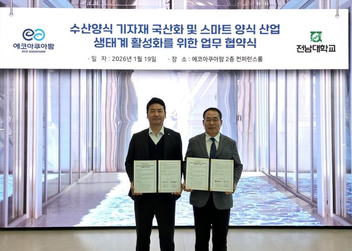 한방통신사 신다은기자 기자 | 전남대학교 스마트수산양식연구센터(센터장 김태호 교수)가 에코아쿠아팜(주)와 스마트양식 분야 기술협력 및 인력양성 강화를 위한 업무협약을 체결했다. 업무협약식은 19일 부산 에코아쿠아팜(주) 2층 컨퍼런스 홀에서 진행됐다.
