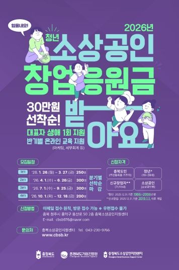 한방통신사 권영분기자 기자 | 충북도와 (재)충청북도기업진흥원(소상공인지원센터)이 ‘2026년 청년 소상공인 창업응원금 지원사업’의 1분기 참여자 250명을 1월 26일부터 오는 3월 27일까지 선착순으로 모집한다.