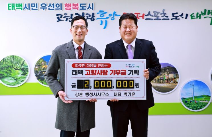 한방통신사 양호선기자 기자 | 태백시는 지난 27일 강훈 행정사무소 박기훈 대표가 태백시청을 방문해 고향사랑기부금 200만 원을 기탁했다고 밝혔다.