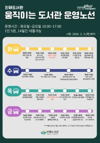 이영화 진해도서관과장은 “움직이는 도서관은 시민의 생활 공간으로 직접 찾아가는 독서 서비스”라며 “이번 노선 확대를 통해 주민들이 일상 속에서 보다 편리하게 책을 이용할 수 있도록 하고, 지역 독서문화 활성화에 기여하겠다”고 전했다.