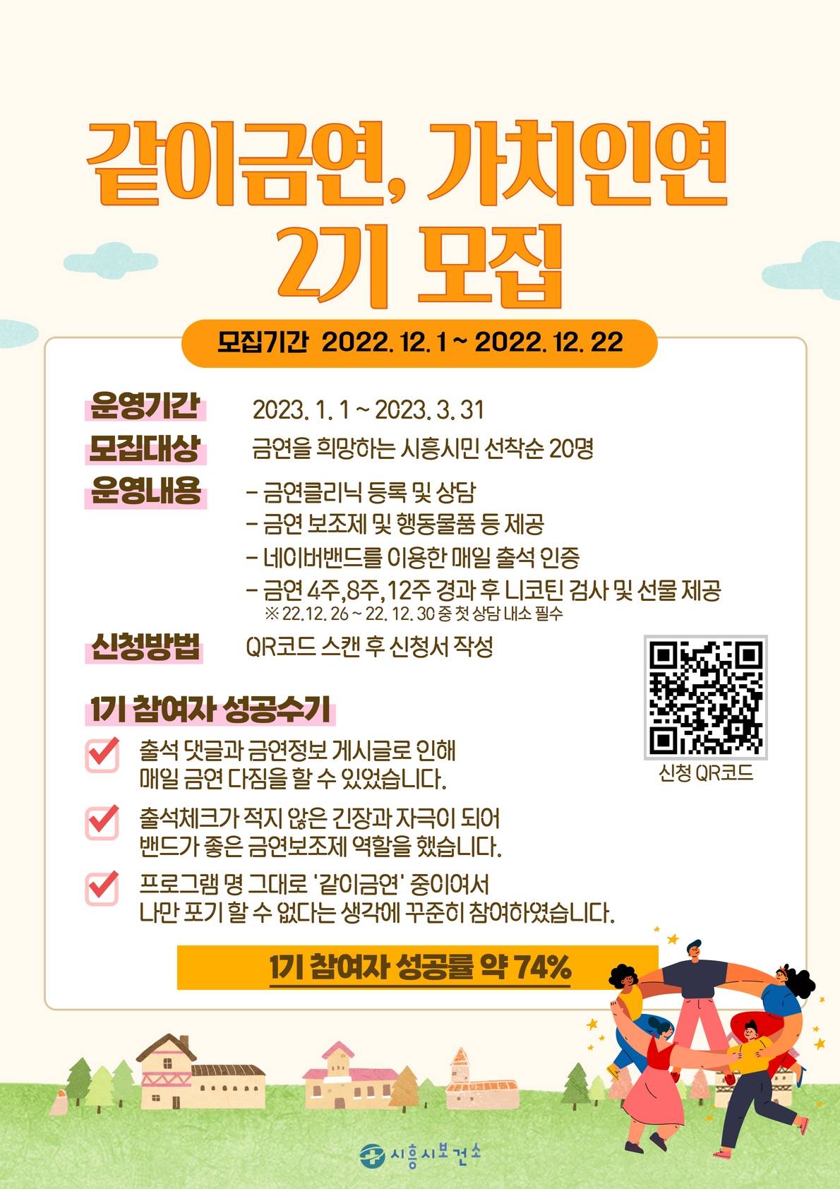 시흥시보건소 관계자는 “매일 참여자의 금연 진행 상황체크 및 즉각적인 금연 상담이 가능해 보다 쉽고 즐겁게 금연을 유지할 수 있어 1기 참여자 중 약 74%가 3개월 금연에 성공했다”고 밝혔다. 이어 “건강에 대한 민감도 상승으로, 가정을 이룬 30~50대의 금연 욕구와 의지가 가장 강한 만큼, 새해맞이 건강생활 실천을 위한 「같이금연, 가치인연」2기를 모집하게 됐다”는 취지를 전했다.