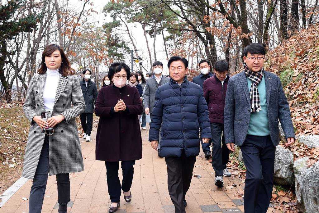 또한, 다음 현장인 호원초등학교를 방문해 통학로와 관련해 살펴보았다. 의정부 롯데캐슬아파트 초등학생들의 배정학교는 호원초등학교로, 통학 차량을 이용하지 못하는 학생들이 주로 통학로로 이용하는 직동근린공원 산책로를 걸으며 현장을 확인했다.
