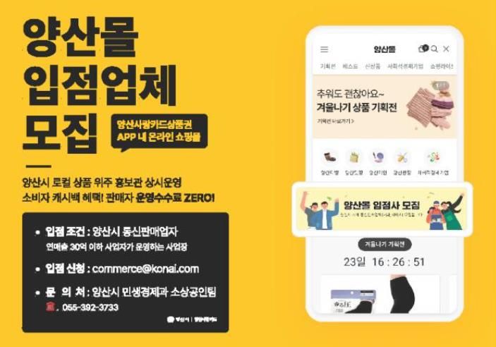입점 신청은 대행업체 코나아이 또는 양산시 민생경제과 소상공인팀을 통해 상시 가능하다.