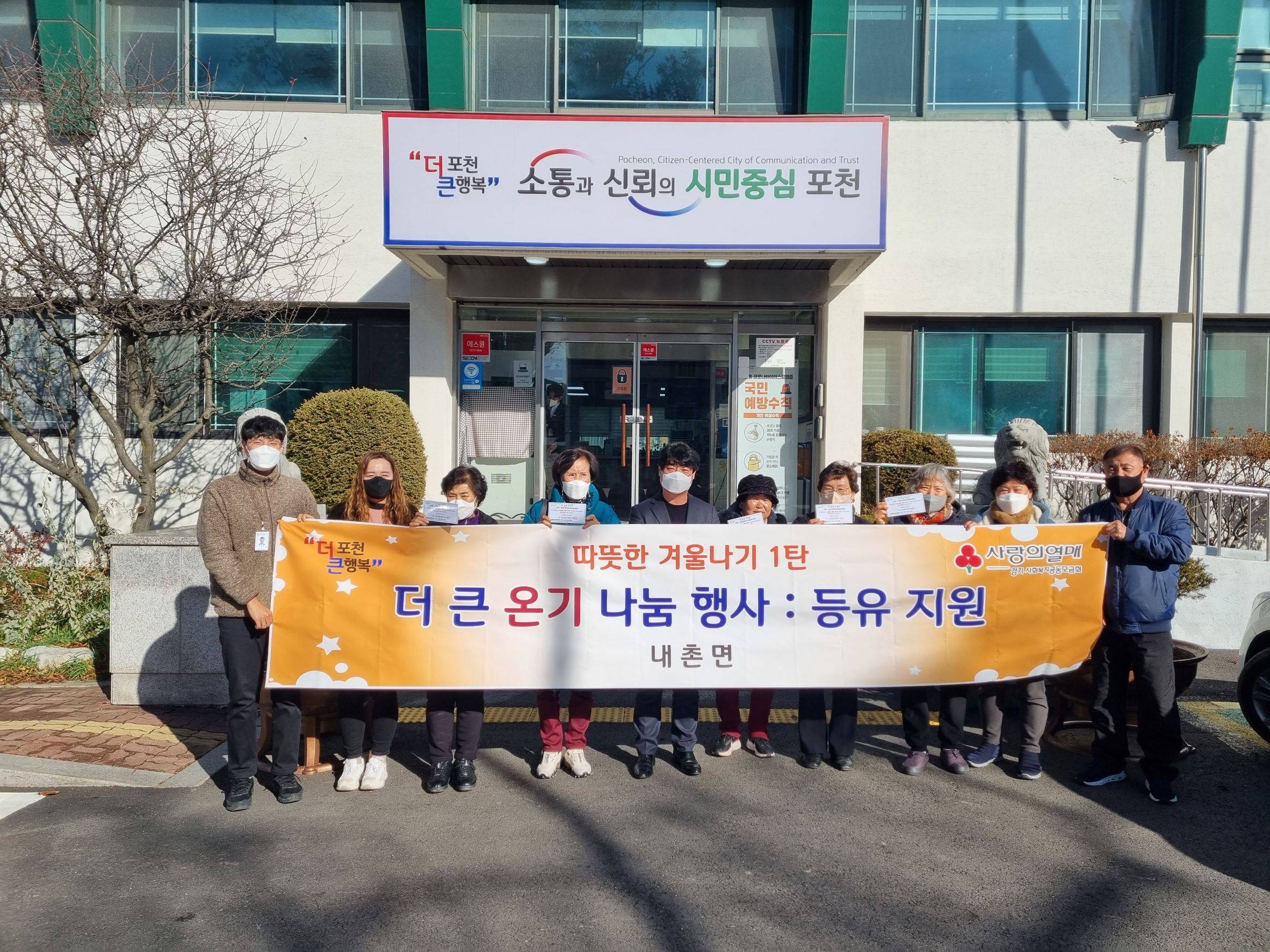 행사는 내촌면·경기사회복지공동모금회 정기후원 모금액으로 마련했으며, 내촌면 지역사회보장협의체(위원장 김경애)에서 지역에서 새롭게 발굴한 한파취약계층에게 등유 지원 쿠폰을 전달했다. 내촌면 지역사회보장협의체는 발굴 대상자들을 모니터링하며 지속적으로 불편사항을 개선할 예정이다.