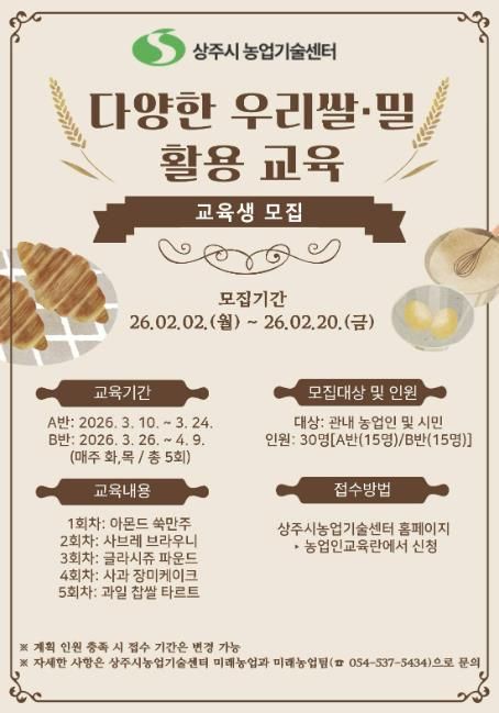한방통신사 신유철기자 기자 | 상주시농업기술센터는 2월 2일부터 2월 20일까지‘다양한 우리쌀·밀 활용 교육’교육생을 모집한다고 밝혔다.