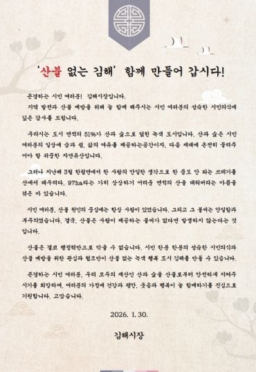 김해시장은 “다음 세대에 온전히 물려주어야 할 귀중한 자산 푸른 숲이 한순간의 방심으로 잿더미가 될 수 있다”며 “산불 예방을 위한 관심과 협조를 당부드린다”고 말했다.