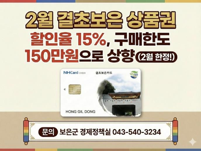 군은 2월 한 달간 카드형 결초보은상품권에 한해 할인율을 기존 10%에서 15%로 상향하고, 월 구매한도를 100만 원에서 150만 원으로 확대해 운영할 계획이다. 이에 따라 카드형 상품권을 최대 한도로 구매할 경우 150만 원어치를 127만 5000원에 구입할 수 있다.