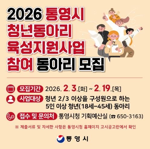한방통신사 신유철기자 기자 | 통영시는 청년들의 자발적인 사회 참여와 활발한 활동을 촉진하기 위해 2026년 청년동아리 육성지원 사업을 시행한다고 3일 밝혔다.