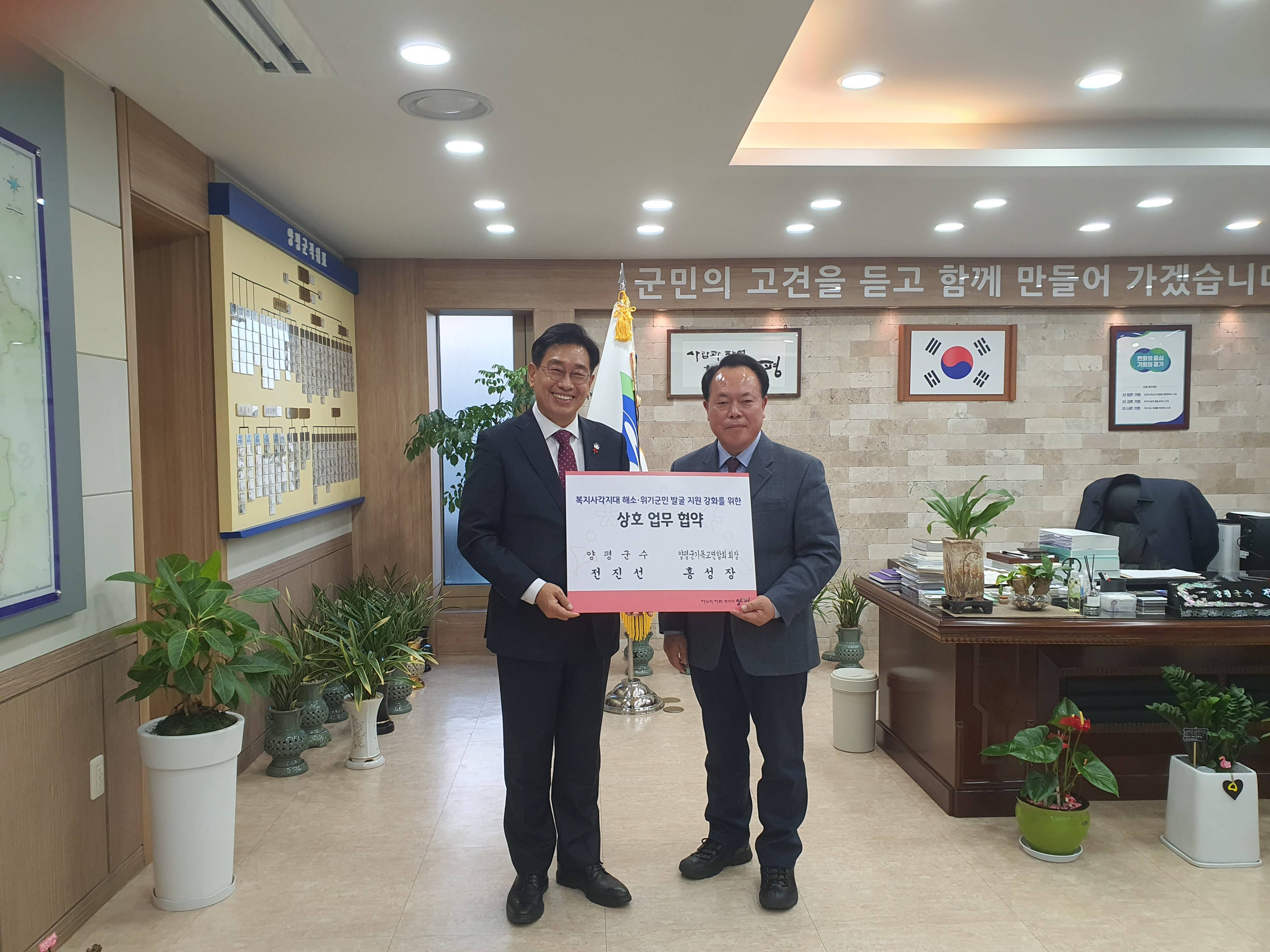 전진선 군수는 “오늘 업무협약식을 계기로 복지위기가구에 대한 적극적인 발굴 및 지원 효과가 기대된다”라며, “앞으로도 적극적인 민관의 업무 협조로 촘촘한 지역보호체계 구축에 힘쓰겠다”라고 말했다.
