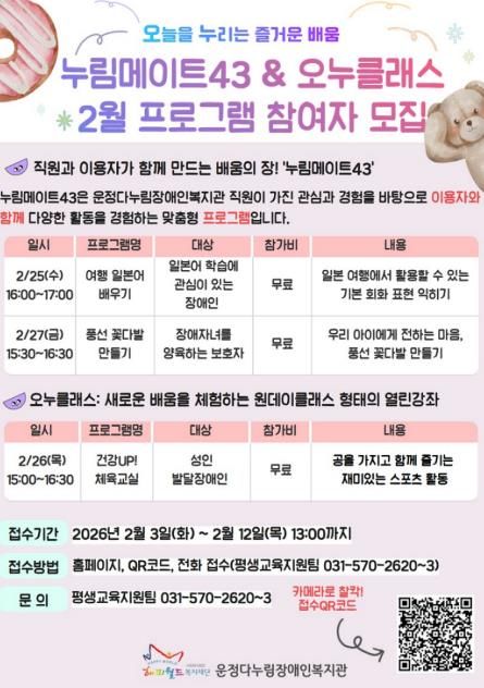 한방통신사 신유철기자 기자 | 파주시 운정다누림장애인복지관은 참여형 평생학습 프로그램 ‘누림메이트43’을 운영하며, 정규 강좌로는 담기 어려운 소규모 학습 수요를 반영한 생활 밀착형 배움을 실천하고 있다.