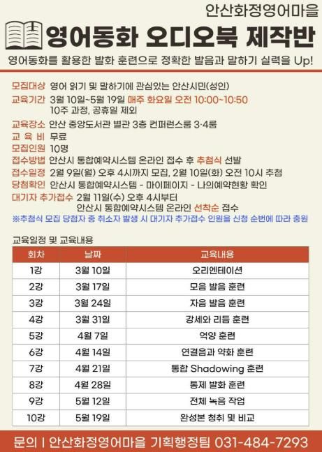 한방통신사 신유철기자 기자 | 안산시가 설립하고 안산대학교가 운영하는 안산화정영어마을이 성인 영어 학습자를 위한 ‘영어동화 오디오북 제작반’을 3월부터 5월까지 10주 과정으로 안산시 중앙도서관에서 운영한다고 4일 밝혔다.