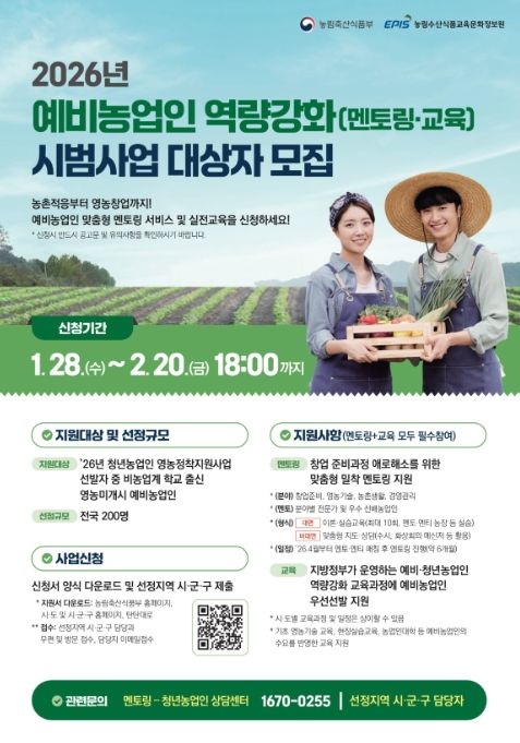 선발된 예비농업인은 약 6개월간 전문가 및 선배농업인과 1:1 맞춤형 멘토링을 받게 된다. 멘토링은 농수산식품교육문화정보원이 운영하며, 창업 준비와 영농기술, 농촌 정착 등 희망 분야에 따라 맞춤형으로 지원된다.