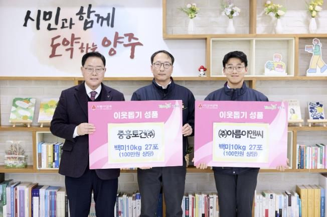 한방통신사 신유철기자 기자 | 양주시가 지난 3일 시장실에서 중흥토건㈜과 ㈜아름이앤씨로부터 이웃돕기 성품으로 백미 10kg 54포(200만 원 상당)를 기탁받았다.