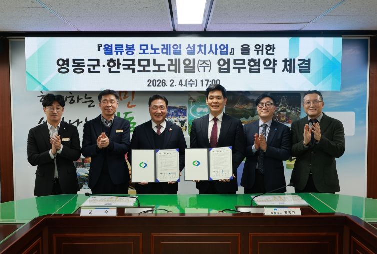 영동군은 4일 오후 군청 상황실에서 한국모노레일㈜과 월류봉 모노레일 설치를 위한 업무협약(MOU)을 체결하고, 민·관 협력을 바탕으로 관광 인프라를 확충해 체류형 관광 활성화에 나선다고 밝혔다.