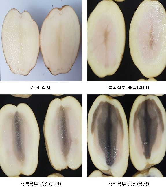 ‘흑색심부’는 감자 내부 조직이 검게 변하는 생리장해로, 밀폐된 상태에서 장기간 저장하거나 수송할 경우 감자의 호흡 과정 중 산소 공급이 원활하지 않아 발생한다.