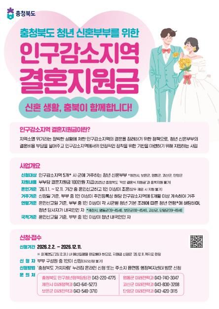 신청 기간은 오는 12월 11일까지며 요건을 갖춘 신혼부부는 ‘충청북도 가치자람’ 홈페이지를 통해 온라인으로 신청하거나 주소지 관할 읍·면 사무소를 방문해 신청하면 된다.
