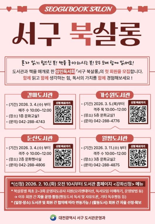 한방통신사 신태공 기자 | 대전 서구 4개 공공도서관(갈마, 가수원, 둔산, 월평)은 주민들을 대상으로 책과 도서관을 매개로 한 성인 독서회 ‘서구 북살롱’을 운영한다고 5일 전했다.
