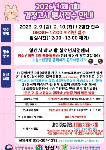 한방통신사 신유철기자 기자 | 양산시 학교 밖 청소년지원센터는 학교 밖 청소년들의 2026년 제1회 검정고시 응시를 지원하기 위해 대리 원서접수처를 운영한다.