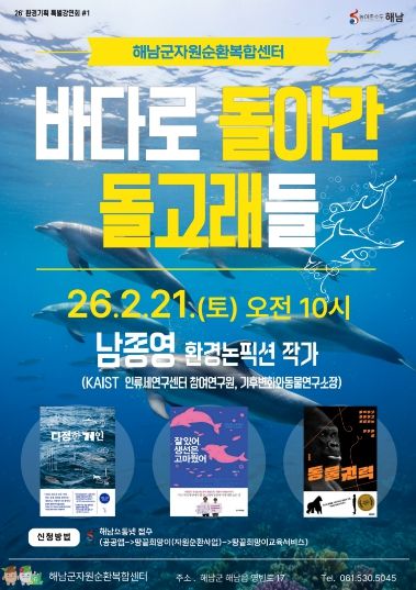 한방통신사 신다은기자 기자 | 해남군자원순환복합센터는 오는 21일 환경논픽션 작가 남종영을 초청해 ‘바다로 돌아간 돌고래들’특별강연을 개최한다.