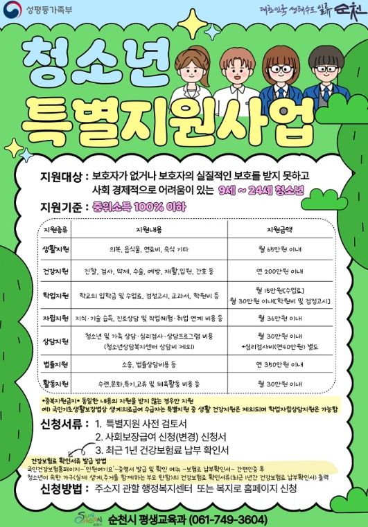 한방통신사 신다은기자 기자 | 순천시는 청소년의 건강한 성장지원 및 자립을 지원하고자 오는 27일까지 ‘청소년 특별지원 사업’ 대상자를 모집한다고 밝혔다.