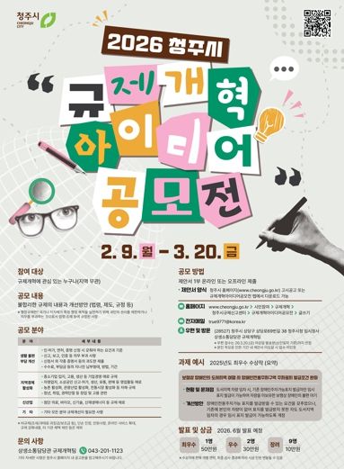 한방통신사 권영분기자 기자 | 청주시는 시민이 체감할 수 있는 다양하고 창의적인 규제개혁 아이디어를 발굴해 일상생활과 경제활동을 제약하는 규제를 적극 개선하고자 ‘2026 청주시 규제개혁 아이디어 공모전’을 개최한다고 8일 밝혔다.