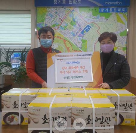 장기동 행정복지센터(동장 한흔지)에 기부행렬이 이어지고 있다. 지구이엔에스(대표 김원훈)는 지난 16일 장기동 저소득 주민을 위한 45만 원 상당의 떡국 30박스를, 장기동 주민자치회(회장 백석남)에서는 친환경세제 150개와 성금 194,000원을 장기동에 기탁했다.