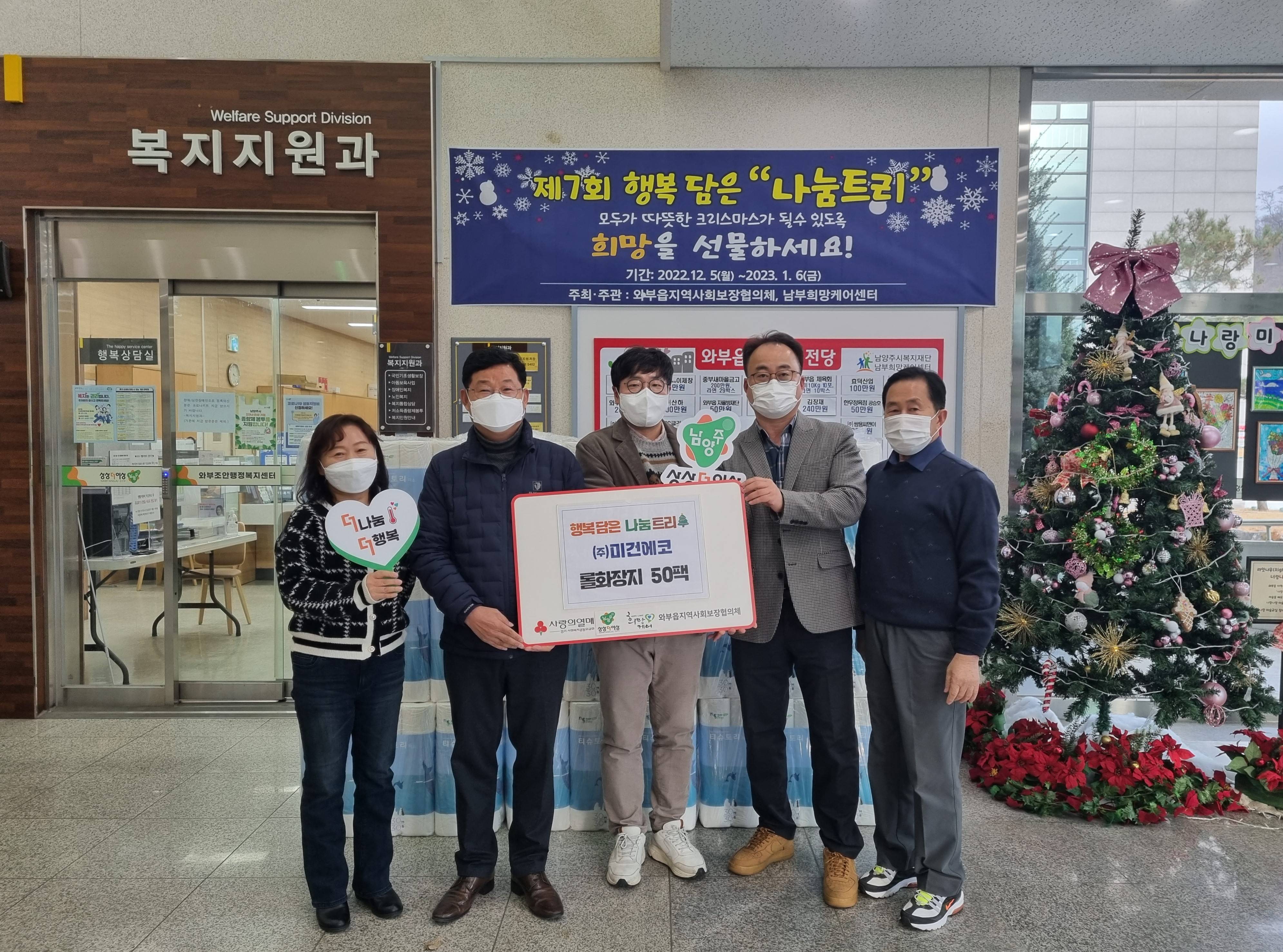 ㈜미건에코 송대성 대표는 “기부를 하고 싶어도 그동안 기회가 없어 아쉬웠는데 이번에 와부읍 나눔트리를 통해 나눔에 참여할 수 있어 기쁘다.”라고 전했다.