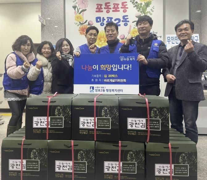 한방통신사 신유철기자 기자 | 영통구 망포2동 행정복지센터는 지난 6일 망포2동 바르게살기위원회가 관내 저소득 가정을 지원하기 위해 김 20박스를 기탁했다고 밝혔다.