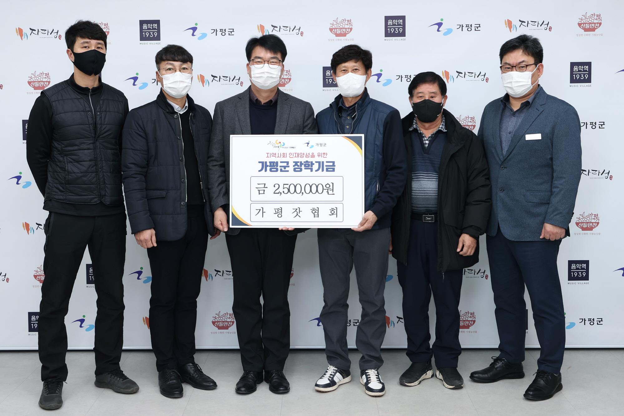 지난 19일, 가평잣협회(회장: 이규열)가 가평의 지역인재양성을 위한 장학기금을 기탁했다. 가평잣협회 이규열 회장과 임원들은 19일 오전 가평군수실에서 기탁식을 갖고 장학기금 250만원을 가평군에 전달했다.