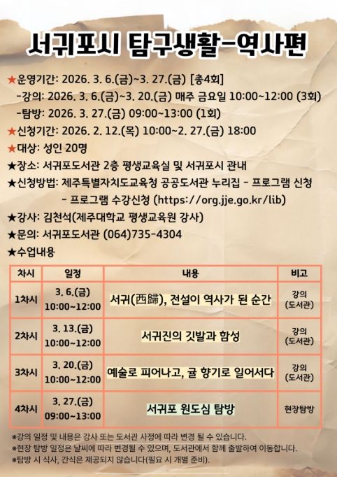 이번 1분기 프로그램인 ‘서귀포시 탐구생활–역사편’은 김천석 제주대학교 평생교육원 강사의 지도로 총 4회 과정으로 운영되며 옛 기록 속 서귀포의 역사와 원도심에 남겨진 예술인의 삶을 심도 있게 살펴볼 예정이다.
