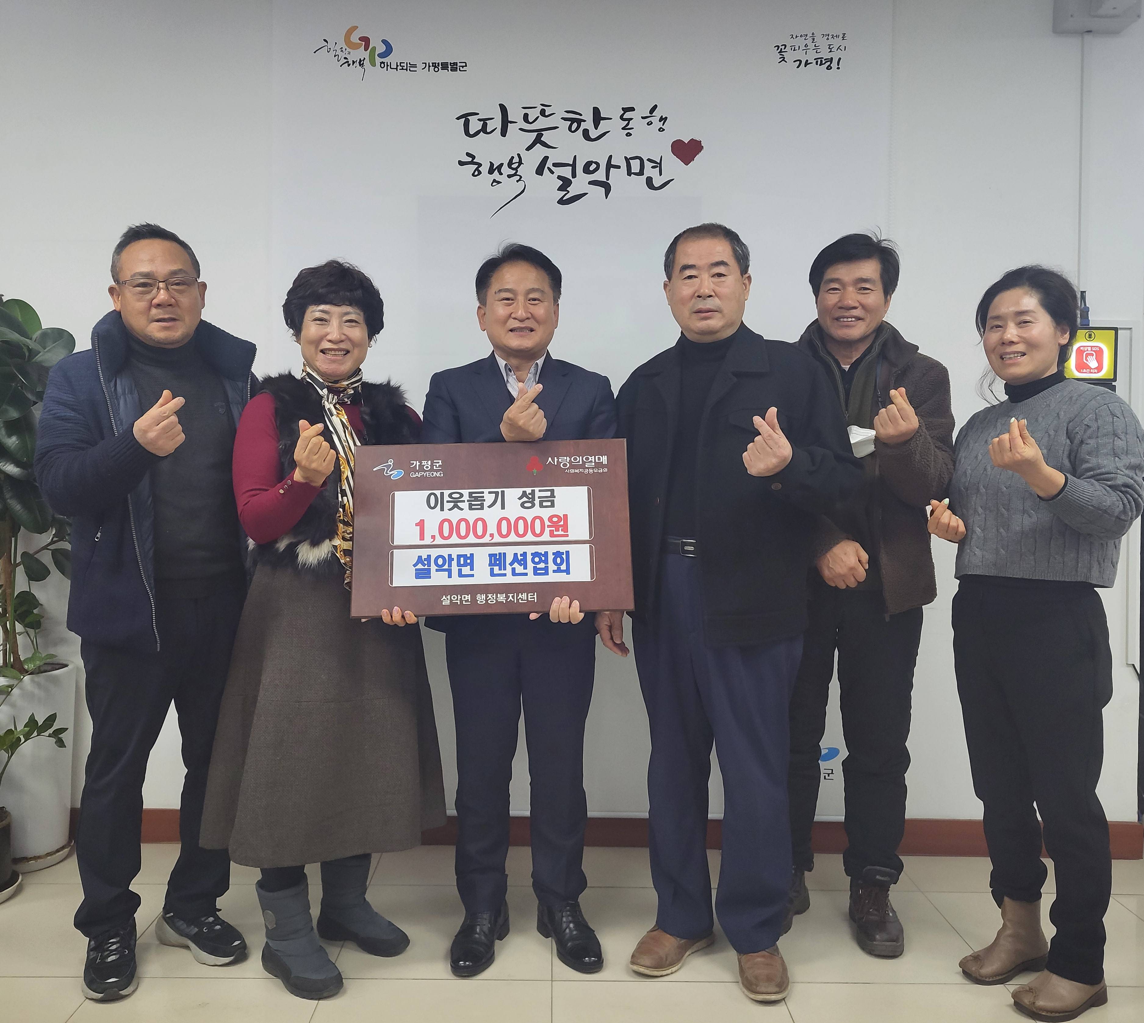 지난 12월 6일 설악면 펜션협회(회장 하명윤)는 설악면 행정복지센터를 찾아 이웃돕기 성금 100만원을 전달했다.