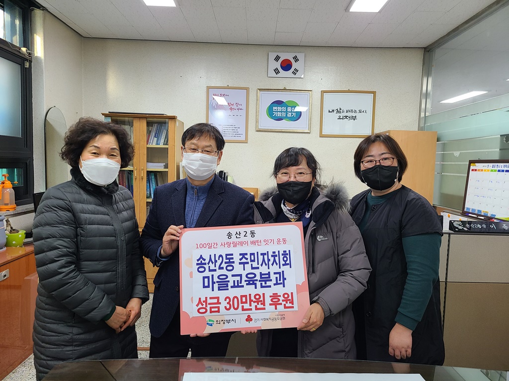 의정부시 송산2동주민센터(동장 이종일)는 16일 송산2동 주민자치회 마을교육분과(분과장 김선영)에서 성금 30만 원을 후원했다고 밝혔다.