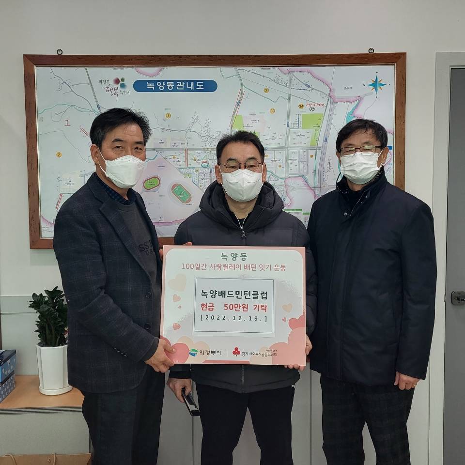 의정부시 녹양동 주민센터(동장 김상록)는 19일 녹양배드민턴클럽(회장 권영찬)이 성금 50만 원을 기탁하며 100일간 사랑릴레이 배턴을 이어갔다고 밝혔다.