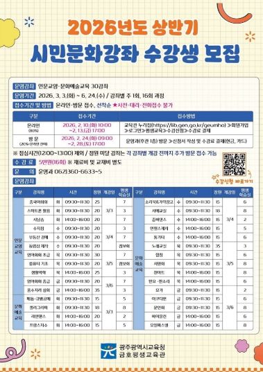 한방통신사 김성의 기자 | 광주시교육청금호평생교육관은 오는 3~6월 ‘2026년 상반기 시민문화강좌’를 운영한다.