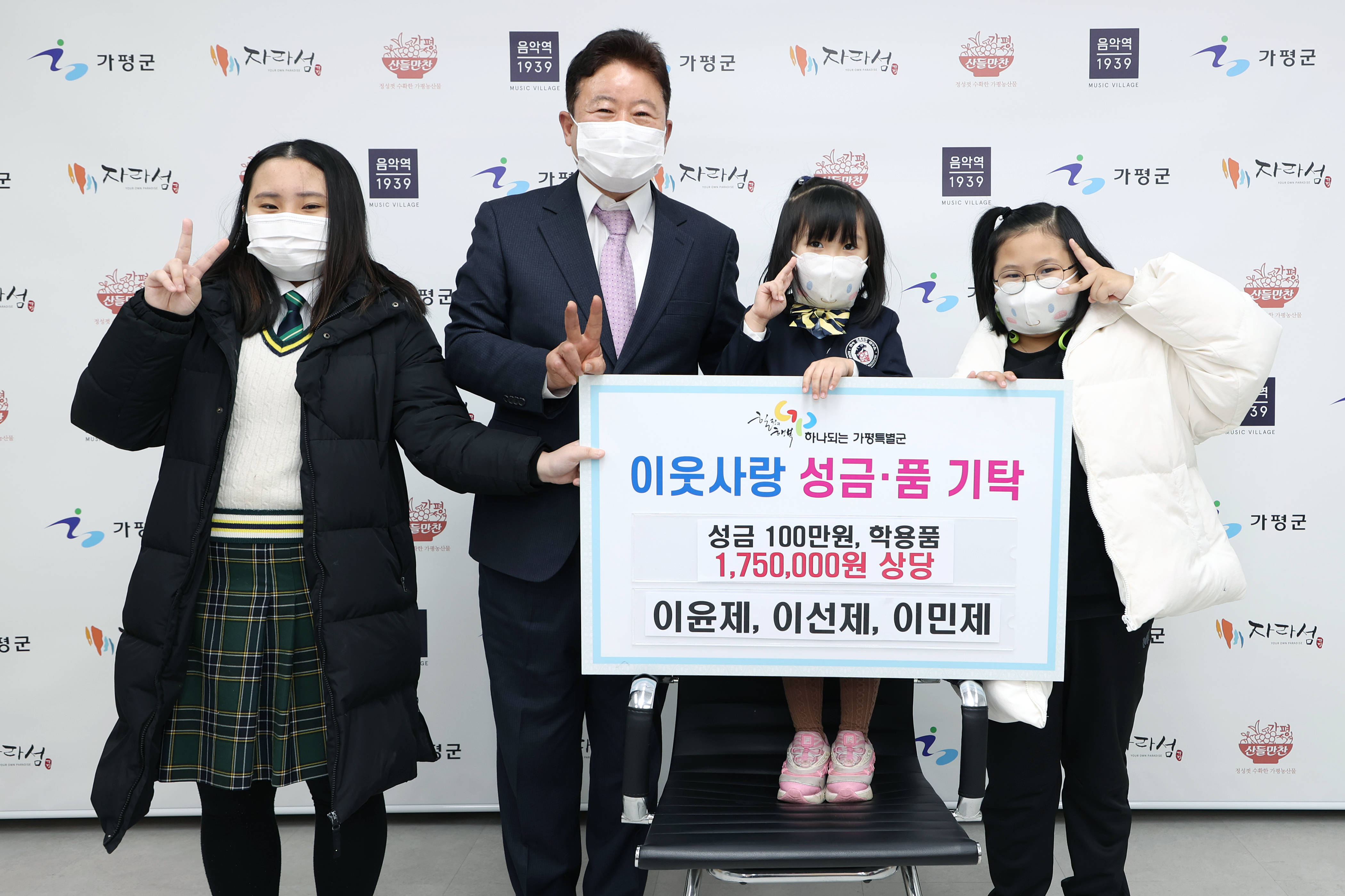 12월 20일, ‘이윤제, 이선제, 이민제’ 세 자매는 연말에 온정의 손길을 모아 소외되고 어려운 이웃을 위해 이웃돕기 성금 100만원과 75만원 상당의 학용품을 군에 기탁하여 전달식을 가졌다.