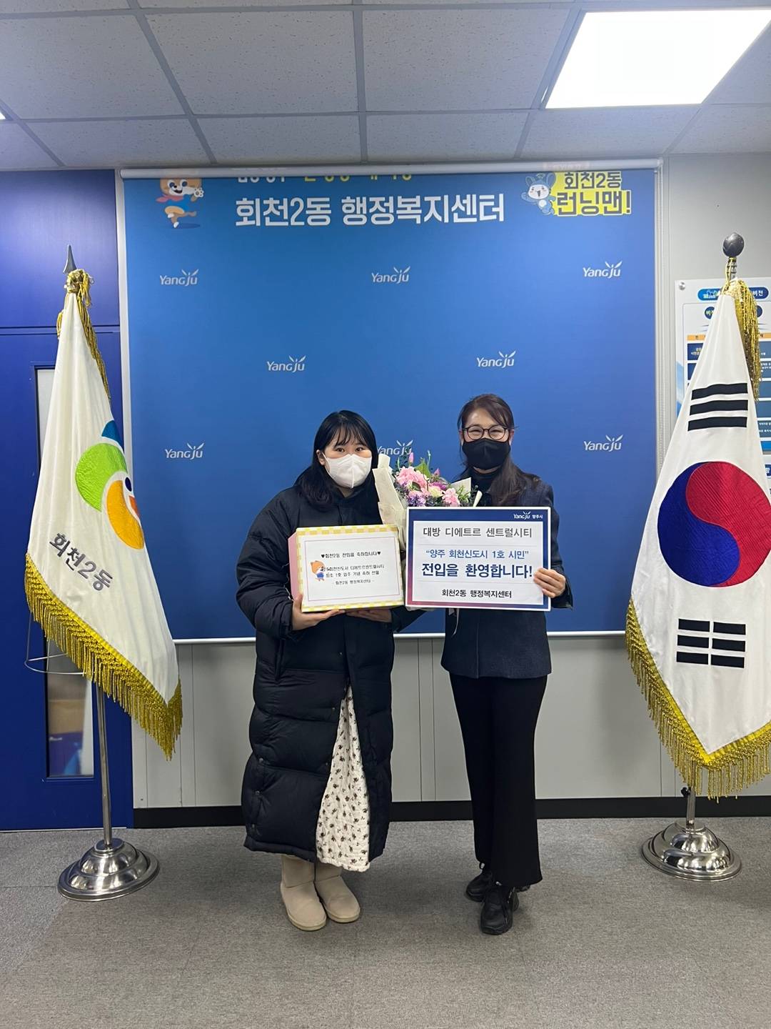 이날 회천2동 행정복지센터는 양주회천신도시 첫 번째 전입신고자에게 전입 안내물 등이 포함된 웰컴박스를 전달했다.