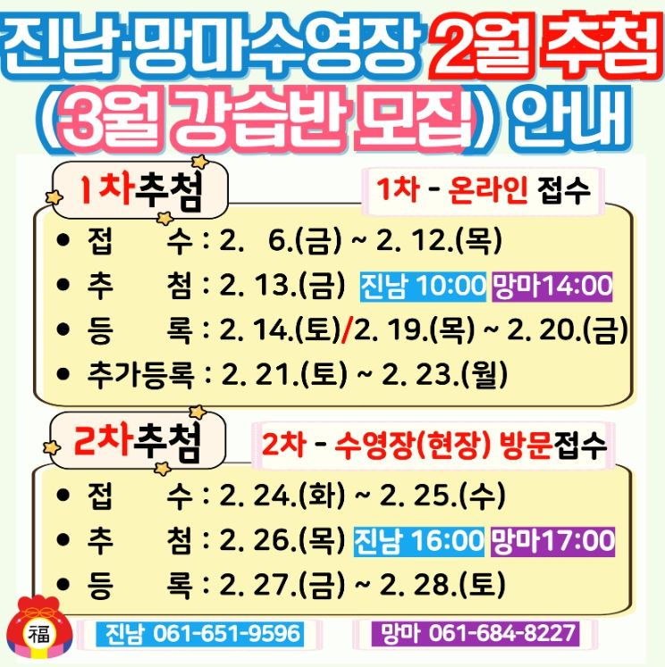 진남수영장과 망마수영장은 2월 12일까지, 웅천수영장은 2월 11일까지 3월 강습반 온라인 접수가 가능하며, 1차 추첨 이후 결원 인원에 한해 2차 방문 접수 및 추첨이 진행된다.
