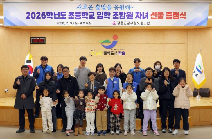 한방통신사 신다은기자 기자 | 장흥군과 장흥군공무원노동조합은 지난 9일, 2026학년도 초등학교 입학을 앞둔 조합원 자녀와 가정을 격려하는 행사를 열고 학용품 세트를 전달했다.