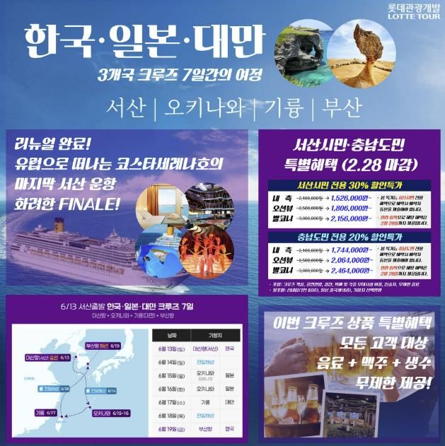 이번 상품은 국제 크루즈선 ‘코스타세레나호’가 서산 대산항에서 출항해 일본 오키나와, 대만 기륭을 거쳐 부산항에 입항하는 코스다.