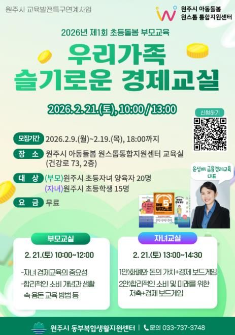 한방통신사 양호선기자 기자 | 원주시 아동돌봄 원스톱통합지원센터는 2월 21일 초등생 가족을 위한 무료 경제 교육인'우리 가족 슬기로운 경제 교실'을 운영한다.