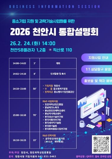 한방통신사 신태공 기자 | 천안시는 오는 24일 천안과학산업진흥원과 함께 천안SB플라자에서 ‘중소기업 지원 및 과학기술사업화를 위한 2026 천안시 통합설명회’를 개최한다고 11일 밝혔다.