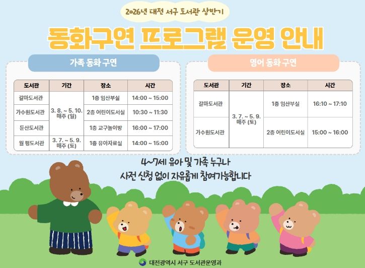 다음 달 7일부터 5월 10일까지 운영되며, 가족 동화구연은 4개 도서관에서 관별 10회씩, 영어 동화구연은 갈마ㆍ가수원도서관에서 각각 10회씩 진행된다.