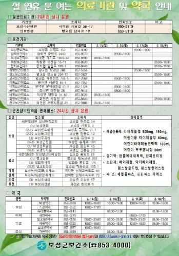 한편, 설 연휴 기간 시설 운영 및 휴관 정보는 보성군청 누리집에서 확인할 수 있으며, 생활 불편 사항은 종합상황실 및 읍면사무소(행정복지센터)로 문의하면 된다.