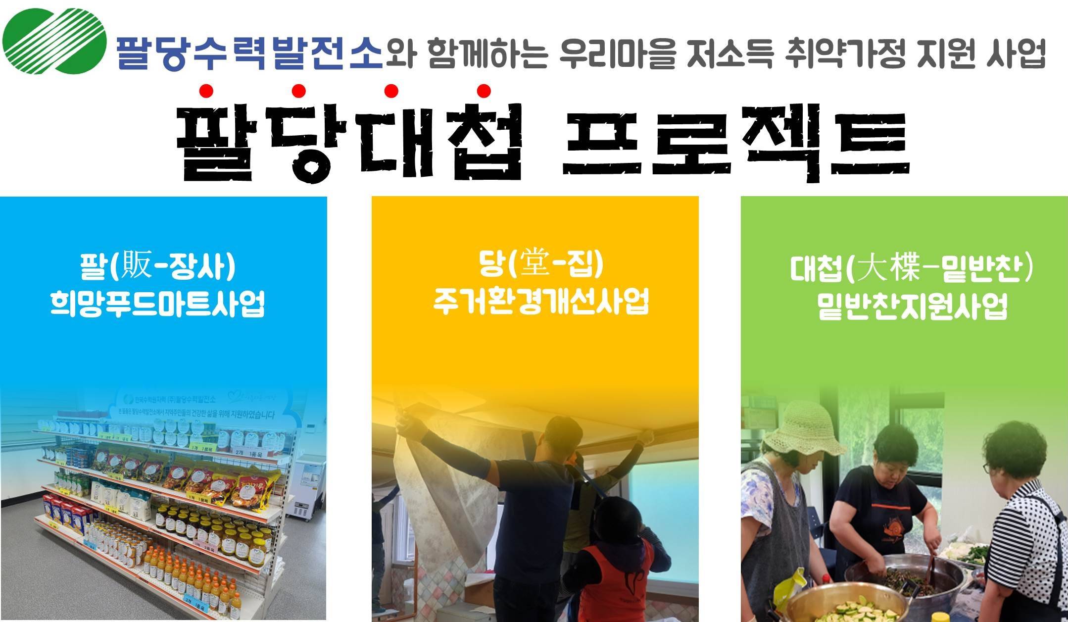 저소득 복지취약가정을 위한 ‘팔당대첩 프로젝트’는 마트장보기 비용을 지원하는 ‘희망푸드마트’ 사업, 주거환경개선사업, 밑반찬 지원사업 등 인간의 기본적인 3가지 욕구인 의식주를 중심으로 일상생활을 지원하는 사업이다.