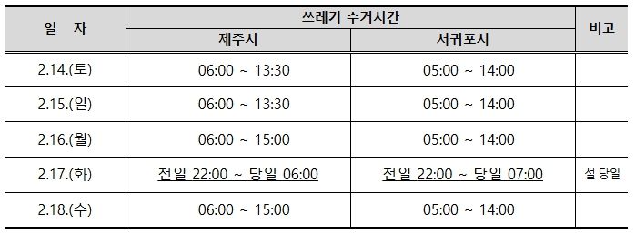 임홍철 제주도 기후환경국장은 “설 연휴에도 쓰레기 처리와 관련한 불편을 최소화하고 깨끗한 환경을 유지하기 위해 최선을 다하겠다”며 “쓰레기 줄이기와 올바른 분리배출 등 도민 여러분의 적극적인 협조를 당부드린다”고 밝혔다.