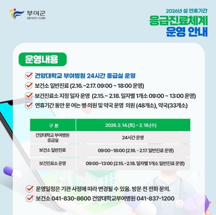 연휴 기간에는 지역응급의료기관인 건양대학교부여병원 응급실이 24시간 운영되며, 관내 병의원 48개소와 약국 33개소를 ‘문 여는 병의원 및 약국’으로 지정·운영하여 진료 공백을 최소화할 계획이다.