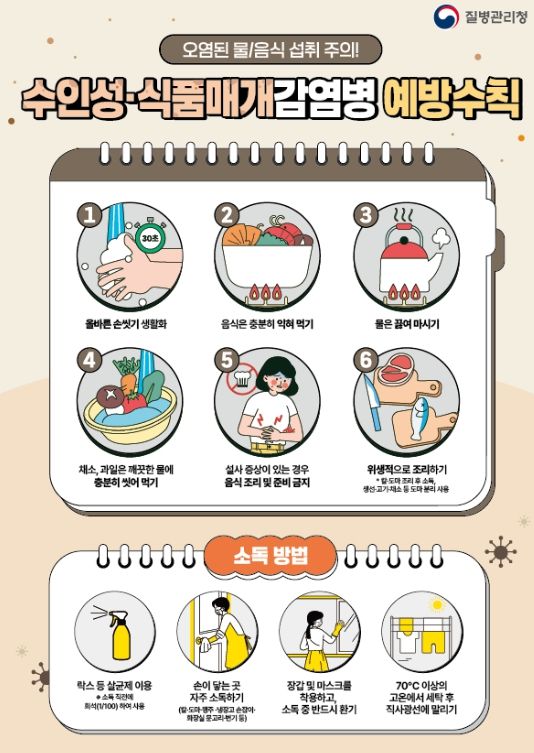 감염병 예방을 위해서는 △흐르는 물에 30초 이상 비누로 손 씻기 △음식은 85도에서 1분 이상 충분히 익혀 먹기 △물은 반드시 끓여서 마시기 △칼과 도마는 채소용, 육류용, 어패류용으로 구분해서 사용하기 △설사 등 증상이 있는 경우 조리하지 않기 등의 수칙을 지켜야 한다.