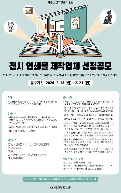 한방통신사 신다은기자 기자 | 화순군은 12일 화순군립최상준미술관 기획전 ‘형태의 잠언’ 展 전시 인쇄물(도록, 리플릿) 제작을 전문적으로 수행할 업체를 공개 모집한다고 밝혔다.