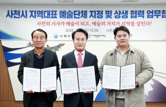이번 협약은 문화체육관광부 주관 '2026 지역대표예술단체 지원사업' 선정을 계기로 ‘극단 장자번덕’을 사천시를 대표하는 예술단체로 공식 지정하고 행정·재단·단체의 유기적인 협력 체계를 구축하기 위해 마련됐다.